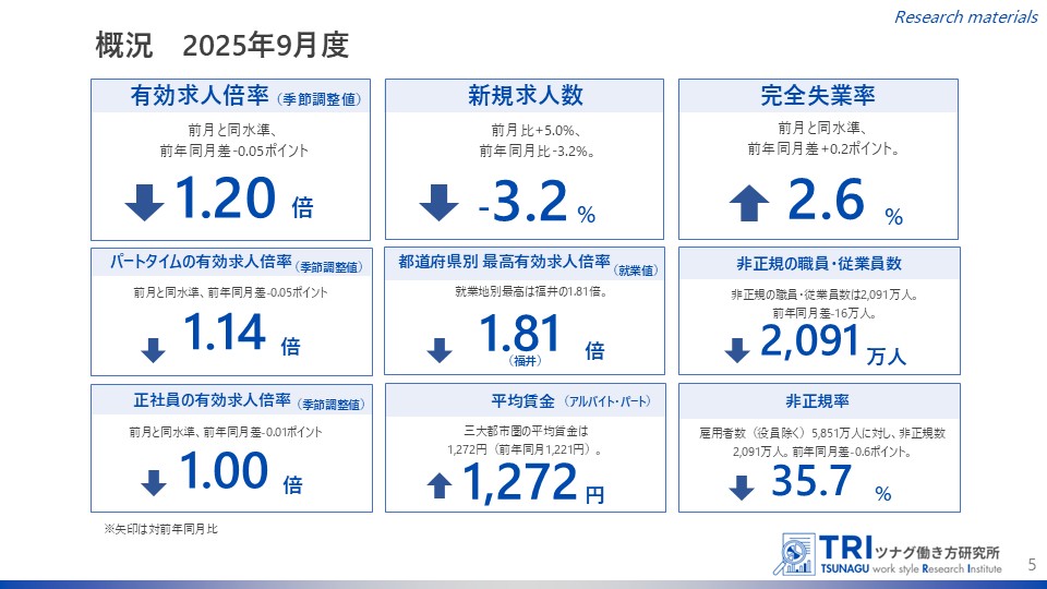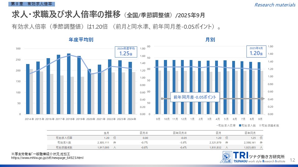 有効求人倍率(季節調整値)は1.20倍 (前月と同水準、前年同月差-0.05ポイント)。