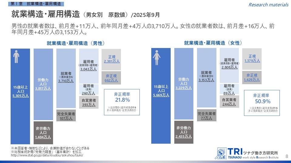 男性の就業者数は、前月差+11万人、前年同月差+4万人の3,710万人。女性の就業者数は、前月差+16万人、前年同月差+45万人の3,153万人。