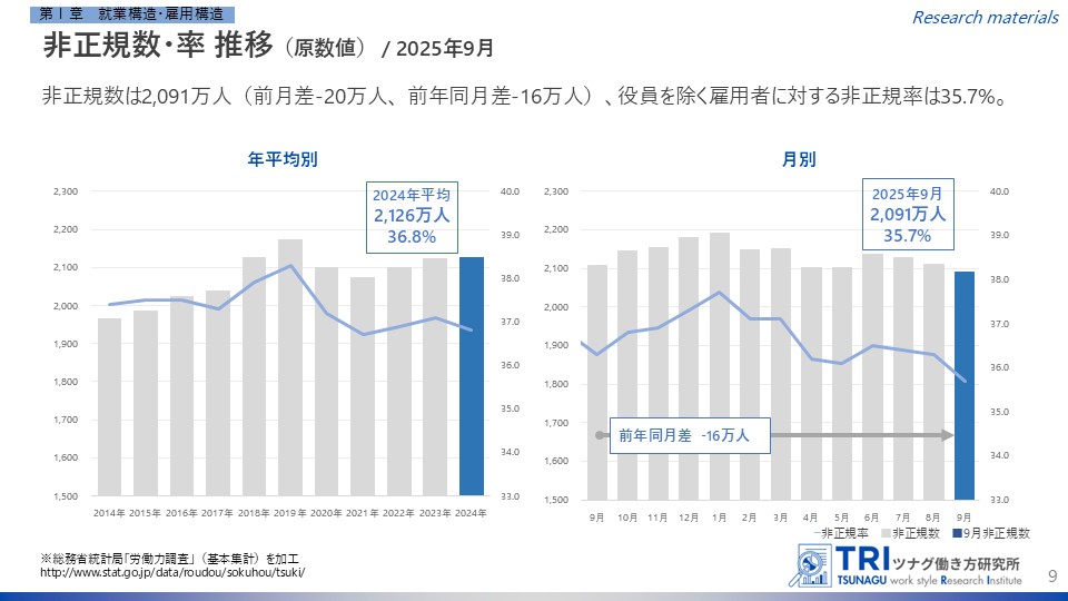 非正規数は2,091万人(前月差-20万人、 前年同月差-16万人)、役員を除く雇用者に対する非正規率は35.7%。
