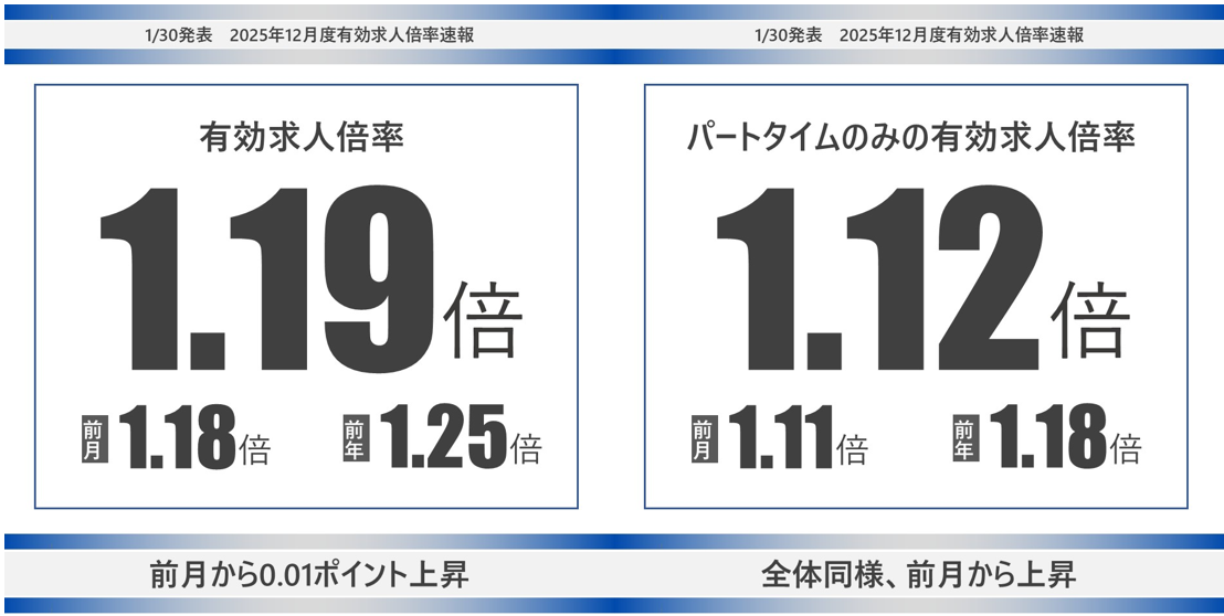 ・2025年12月の有効求人倍率(季節調整値)は1.19倍で、前月から0.01ポイント上昇。