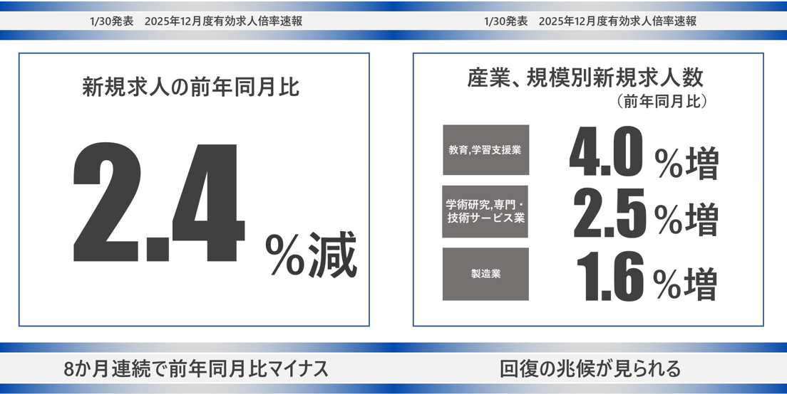 ・新規求人の前年同月比は2.4%減。8か月連続でマイナスとなった。