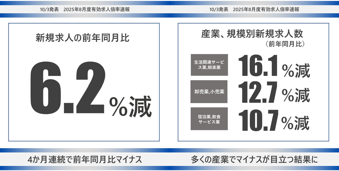 ・新規求人の前年同月比は6.2%減。4か月連続でマイナスとなった。