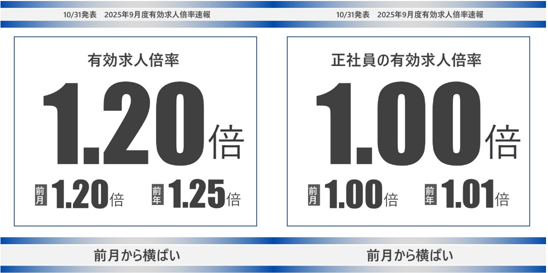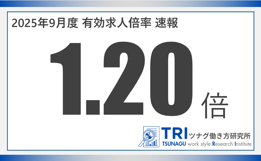 ・2025年9月の有効求人倍率(季節調整値)は1.20倍。前月から横ばいとなった。