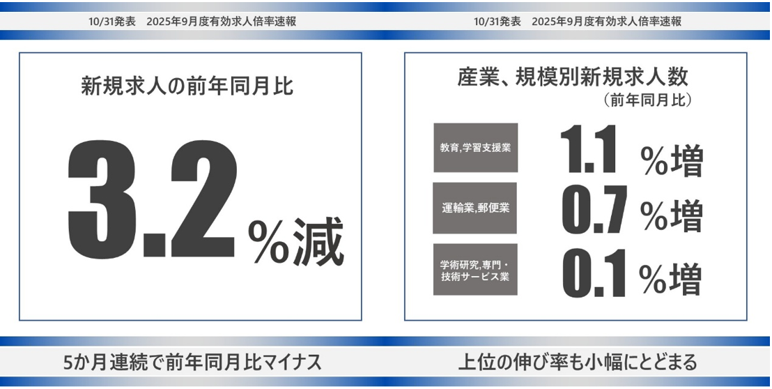 ・新規求人の前年同月比は3.2%減。5か月連続でマイナスとなった。