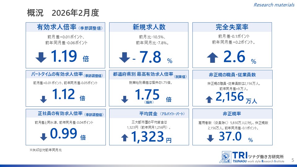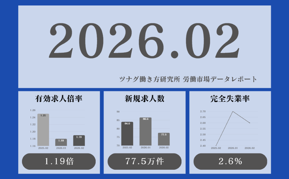完全失業率(季節調整値)は2.6%(前月差-0.1ポイント、前年同月差+0.2ポイント)。完全失業者数は180万人(前月差+1万人、前年同月差+15万人)。