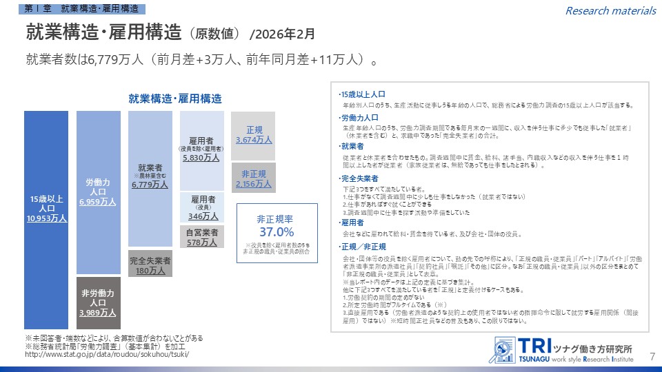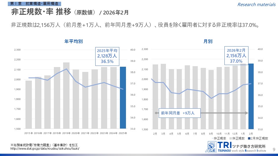 非正規数は2,156万人(前月差+1万人、 前年同月差+9万人)、役員を除く雇用者に対する非正規率は37.0%。