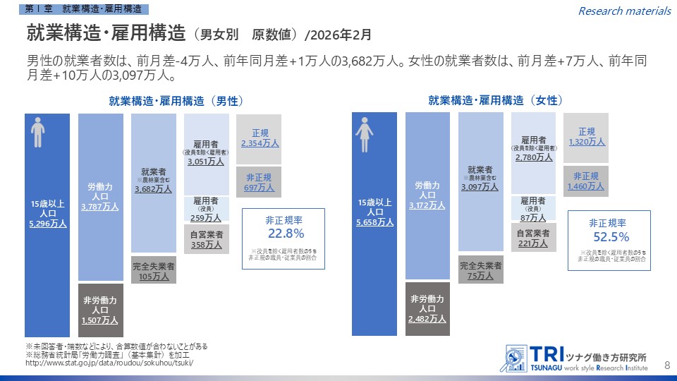 男性の就業者数は、前月差-4万人、前年同月差+1万人の3,682万人。女性の就業者数は、前月差+7万人、前年同月差+10万人の3,097万人。