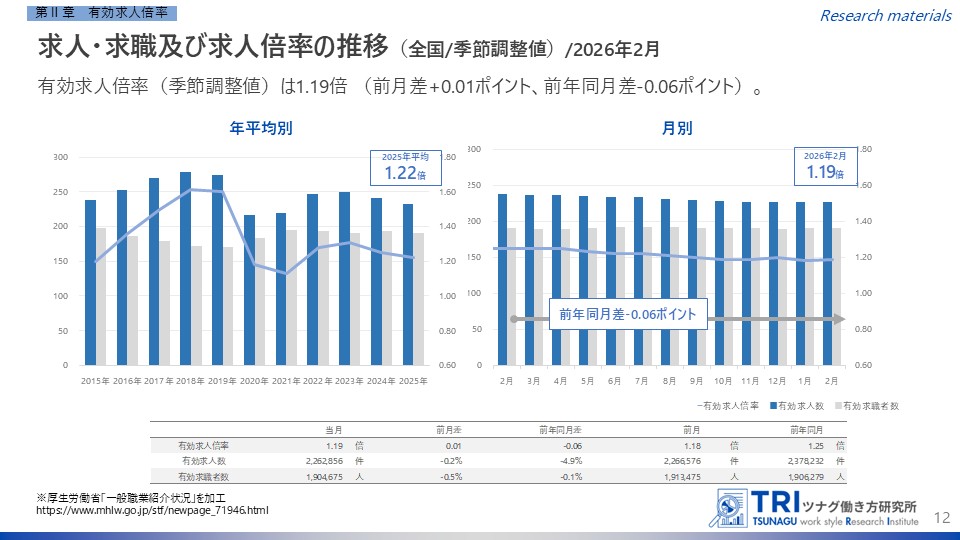 パートタイムの求人倍率(季節調整値)は1.12倍(前月差+0.01ポイント、前年同月差-0.05ポイント)。