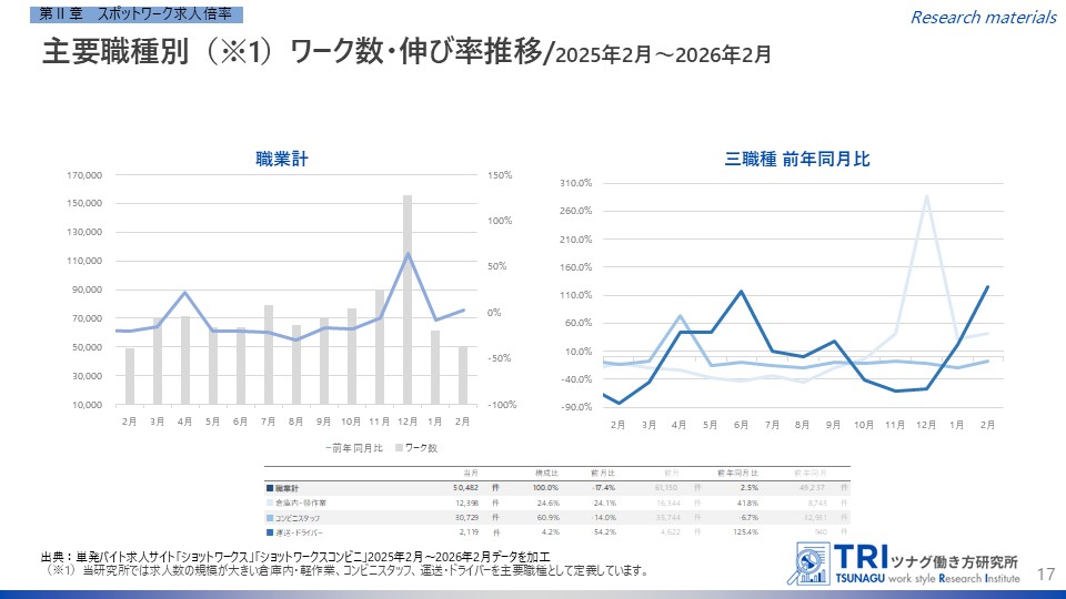 職種別に見ると、「倉庫内・軽作業」は前月比24.1%減、「コンビニスタッフ」は14.0%減、「運送・ドライバー」は54.2%減となっており、特に運送・ドライバーの減少幅が顕著です。一方で、前年同月比では全体で2.5%増と微増にとどまるものの、「倉庫内・軽作業」は41.8%増、「運送・ドライバー」は125.4%増と大きく伸長しています。