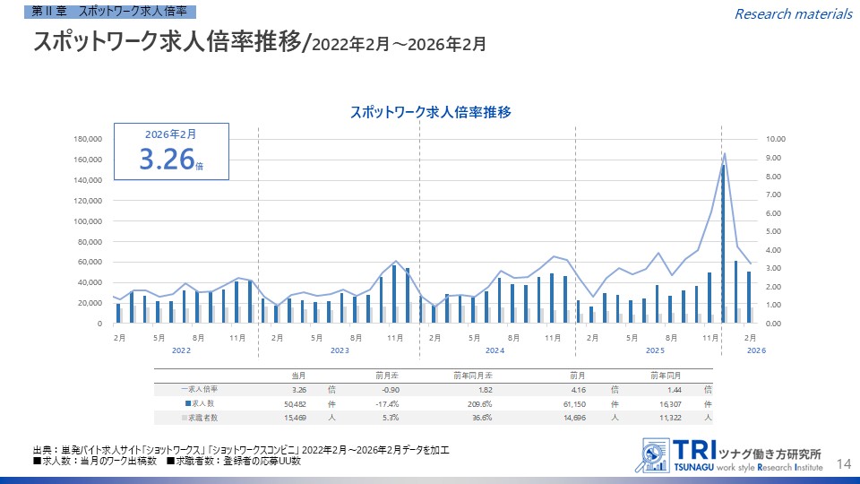 2026年2月度のスポットワーク求人倍率は3.26倍となりました。1月2月にスポットワークの求人数が落ち着くのは例年通りの結果ですが、求人数は前月比17.4%減となり、求人の需要がピークとなる12月と比べて5.99ポイントも下落しました。一方、前年同月からは1.82ポイント上昇しています。