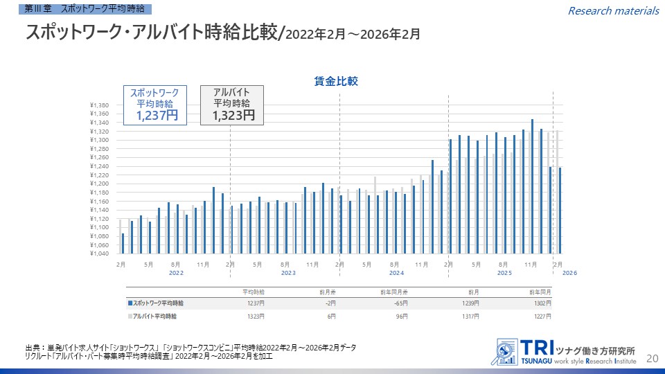 2026年2月度のスポットワーク平均時給は1,237円で、前月差-2円、前年同月差-65円となりました。通常のアルバイト平均時給は1,323円で(※リクルート発表「アルバイト・パート募集時平均時給調査」)、スポットワーク平均時給との比較では、通常アルバイトが86円高いという結果になっています。